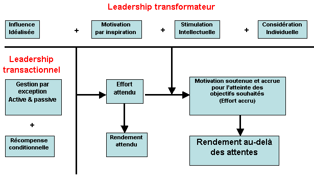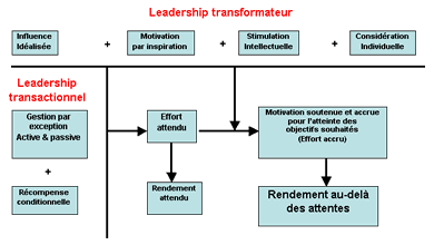 Le diagramme qui suit (d’après Avolio et Bass, Mulifactor Leadership Questionnaire Sampler Set, Mind Garden Inc., 2004) résume bien l’effet multiplicateur du leadership transformateur par rapport au leadership transactionnel. Il se trouve que les méthodes transactionnelles sont largement applicables aux situations routinières et de gestion, tandis que le leadership transformateur est le plus applicable dans des situations de grand stress telles que prévalent en situation de crise et d’urgence.