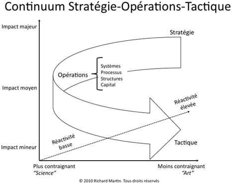 Le schéma illustre comment la stratégie, les opérations et les tactiques diffèrent dans trois dimensions essentielles : l'impact, les contraintes et la réactivité. La spirale descendante dans le sens antihoraire montre aussi comment la stratégie, les opérations et les tactiques sont liées et inter reliées les unes aux autres dans un continuum. La stratégie établit le contexte des opérations et s'appuie sur elles, tandis que les opérations établissent le contexte des tactiques quotidiennes, du comportement et des actions et en dépendent pour réussir.